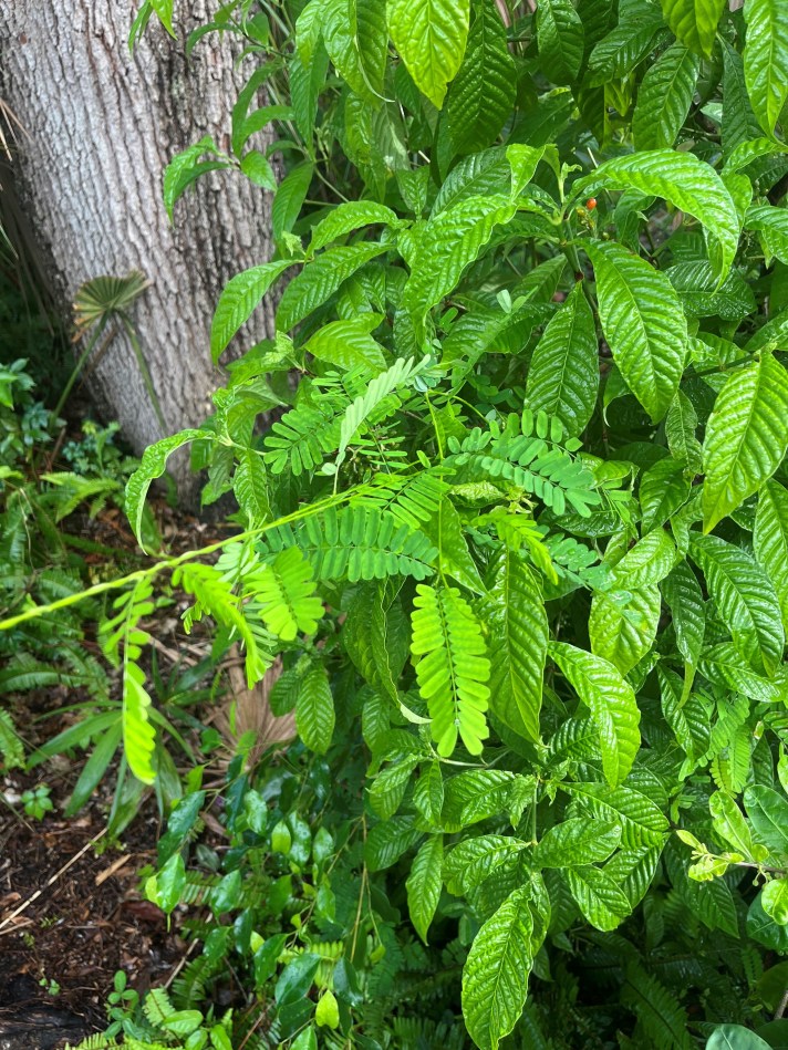 Meanwhile, a new plant has sprung up in our yard, which has defused some of the marital tension in the Furman abode over the tuberous sword fern. Because Wendy and I both agree that this new plant is absolutely an evil plant. It’s called rosary pea, apparently. Non-native and considered invasive. A slender vine with frilly, pinnate leaves that wend their way with terrific speed up the trunks, branches, and stems of our Jamaican caper, stopper, wild coffee, bitterbush, firebush, Bahama strongbark, and any other shrub or tree it manages to latch onto. Its pale green foliage shrouds these plants from all light within weeks if left unchecked, making the tuberous sword fern seem tame by comparison. Wendy and I spend an inordinate amount of time these days side-by-side with plastic buckets unwinding sticky spirals of rosary pea stems from the branches of other plants, yanking them out of the ground by their impossibly stubborn roots. Sometimes, sure, I’ll surreptitiously pluck a pesky tuberous sword fern from the ground and hide it beneath the rosary pea foliage in my bucket. I’m sneaky about it, but the truth is I still don’t like the tuberous sword fern.